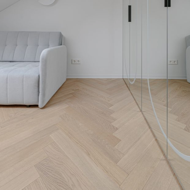 Et elegant fiskebensgulv som kombinerer varme, balanse og kvalitet – skapt for varig skjønnhet og naturlig ro.
